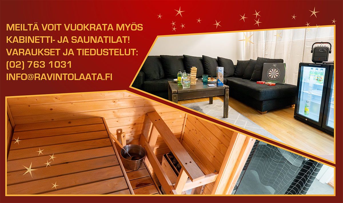 Ravintola Ata soveltuu erinomaisesti myös erilaisten juhlien, kokousten ja yrityksien tilaisuuksien järjestämiseen. Ota yhteyttä ja pyydä tarjous!